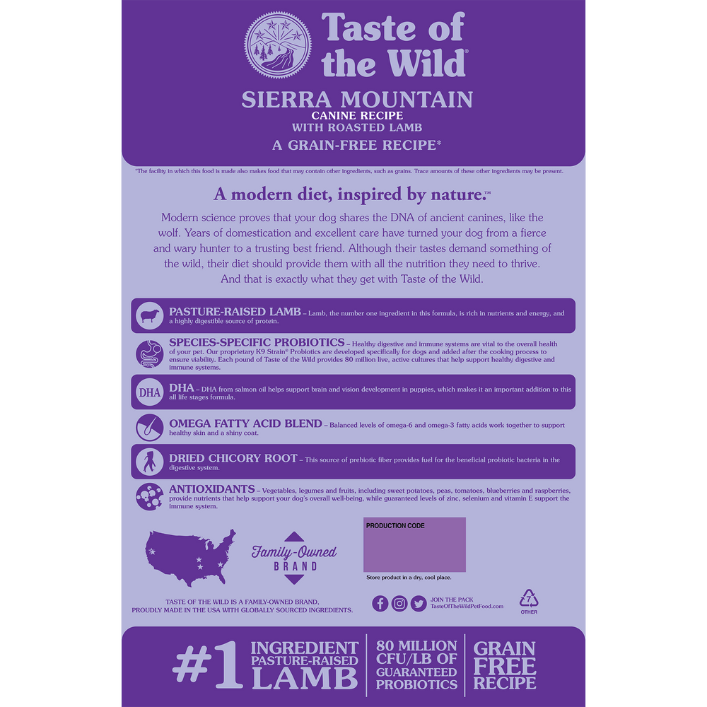 Taste of the Wild Sierra Mountain Canine Recipe is formulated to meet the nutritional levels established by the AAFCO Dog Food Nutrient Profiles for All Life Stages including growth of large size dogs (70 lbs. or more as an adult).